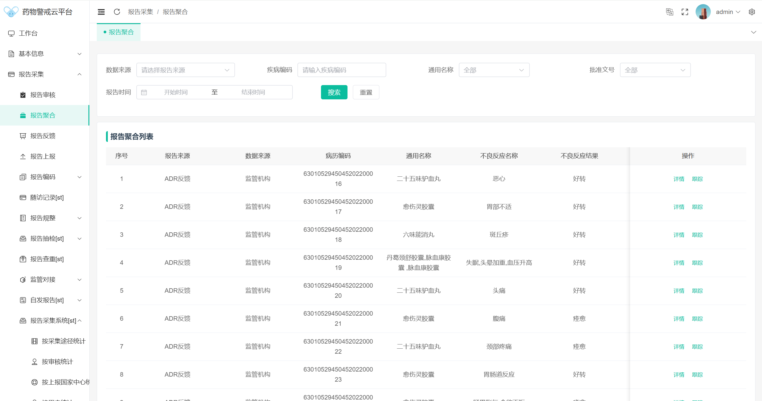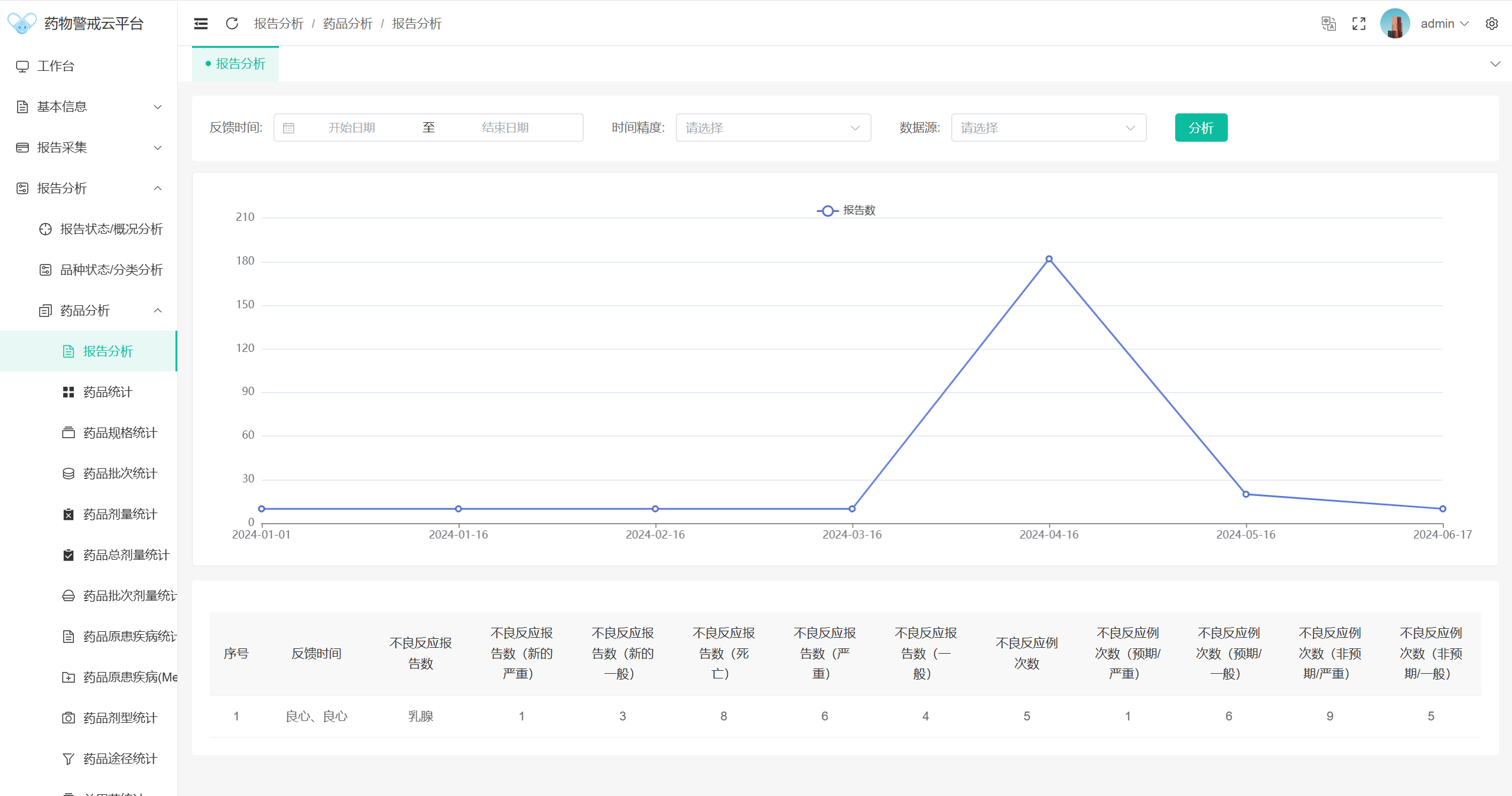 从药品、临床、地域和患者四个维度,细分成数十张详细报表,对ADR报告全方位分析;按天、周、月、全周期等时间跨度分析数据,对数据周期变化情况一目了然;